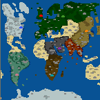 Hipotetyczny konflikt Ameryki Pn. (niebieski), Europy (czerwony), Rosji (zielony), Chin (pomarańczowy), Indii (brązowy), krajów Arabskich (fioletowy), "czarnej" Afryki (jasnoniebieski) i Ameryki Pd. (różowy).