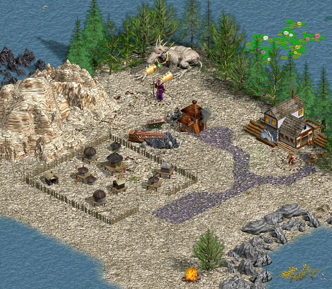 POWIERZCHNIA: Mapa powiela pomysł który widziałem już na mapie ,,Wyspy, tunele, portale” czyli czekające na podbój dziesiątki małych wysepek. Pod względem graficznym jest nieźle choć przydałoby się w niektórych miejscach więcej detali. Wystarczy otworzyć obie mapy w edytorze aby zobaczyć różnicę. Powiedziałbym, że ta jest skromniejszą wersją mapy Tabrisa. Gra się łatwo i przyjemnie. W przeciwieństwie do mapy ,,Chesseboard” autor nie poblokował dróg mocnymi strażnikami więc mogłem porozsyłać zwiadowców i szybko odkryć prawie całą powierzchnię mapy. Zadziałało to też pozytywnie na kolorowych przeciwników. Byli aktywni, często ich spotykałem, potrafili zajmować neutralne obiekty i odbijać zajęte przeze mnie. Parę razy byli blisko by zdobyć któryś z moich miast. Niestety szybko słabli względem moich sił. Ujawniała się tu irytująca przypadłość SI czyli wrogie armie które nie wracają do swych miast po stracie bohaterów, tylko starają się eksplorować mapę samymi istotami aż do ich kompletnego wytracenia, lub odwrotnie, bohaterowie którzy nie wracają do miast by uzupełniać tracone wojska. Trudność na drodze do wygranej polegała więc bardziej na odnajdowaniu przeciwników niż samej z nimi walce. Moją przewagę wzmocnił pewien błąd (tak to widzę). Grałem fioletowymi i szybko podbiłem znajdujące się na południowym wschodzie miasto Larne. Miasto w przeciwieństwie do innych miało budynek Graala. Wylosowałem twierdzę. Graal dał 100% większy przyrost jednostek i 3000 sztuk złota na turę. Doliczyć do tego wybudowane przeze mnie zagrody plus Heros zarządca i w efekcie zbyt szybko odskoczyłem przeciwnikom. Do zdominowania naziemnych sił danego wrogiego stronnictwa wystarczało podbicie jego głównego miasta. Po tym wróg już nie potrafił wyprowadzić jakiejś sensownej kontrofensywy. Jego armie zwiedzały tylko mapę bez większego celu, pokazując się to tu to tam.