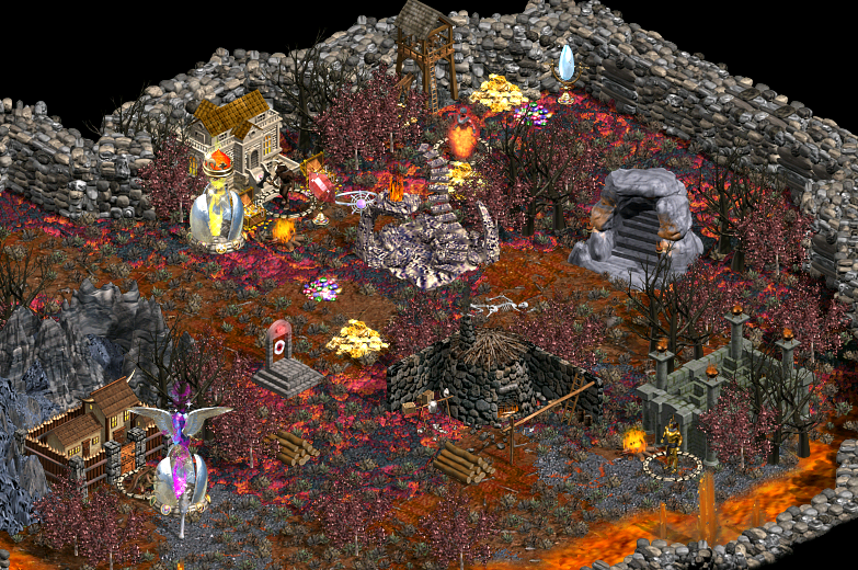 Mapa wygląda znakomicie choć stylem jest raczej klasyczna, bez udziwnień. Imponuje duża ilość detali, autor dopieścił każdy skrawek. Nie ma miejsca gdzie można by powiedzieć: O tutaj autorowi się nie chciało. Teren podziemny otaczają wysepki połączone wodnymi korytarzami, tworząc obwodnicę. Jest to oczywista, opcjonalna droga do zaskakującego ataku na kolorowego wroga. Jedna wysepka przypada na jednego gracza, znajduje się mniej więcej pod miastem startowym. Na wysepce jest dodatkowe miasto. Na wodnej trasie pomiędzy wysepkami można dodatkowo zająć warsztaty oblężnicze. Jest też podziemny obszar wewnętrzny chroniony czerwonymi bramami, tam znajdziemy przede wszystkim dwa miasta: śmierci i chaosu. Kontynenty na których startują gracze są wypełnione z umiarem obiektami przygody. Tyle coby starczyło na początkowy rozwój. Dopóki nie opuścimy swoich terenów może brakować złota czy surowców a i siłą armii imponować nie będziemy. Tutaj pojawia się pierwszy problem: najbliższe dodatkowe dwa miasta neutralne (jedno na powierzchni, drugie w podziemiach) są losowej przynależności. W singlu to raczej bez większego znaczenia. W multi jeden gracz może wylosować takie same miasta a może też odmiennego stronnictwa. Z różnic jeszcze zauważyłem, że: