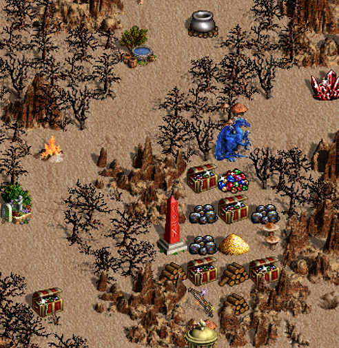 Ogólny koncept mapy zakładał chyba, że po pokonaniu wrogów na powierchni ruszamy do podziemi i najpierw zajmujemy podziemia z lochami (korytarz po lewej), a w końcu idziemy do piekieł. W moim wypadku nie zdecydowałem się na to, mając absurdalnie wielką armię poszedłem pokonać Szatana i jego hordy. Armia była absurdalnie wielka bowiem wcześniej zdobyłem Róg Otchłani i wygenerowałem na tyle dużą ilość Fangarmów, że w bitwie ze srogim hetmanem ciemności mimo utraty 1 700 wciąż miałem ich więcej niż drugie tyle. Ogólnie jednym z problemów mapy jest balans. Choć strefy są różne, to wydaje mi się, że zielony ma najłatwiej. Z misji może otrzymać Kajdany, Portal miejski. Jako jedyny może sobie odsłonić krainę w chatce maga. W strefie między nim a sąsiadem jest wspomniany Róg. Odblokowani zostali wszyscy bohaterowie, tradycyjnie problemem będą Gelu i Dracon z jednej strony, a specjaliści od Sokolego oka i Leczenia z drugiej, te umiejętności też mogą trafić się herosom, bowiem nie są zablokowane. O wiele większy problem to jednak artefakty, bowiem autor mapy odblokował choćby Ostrze armageddonu, czy Miecz anielskiego sojuszu. Zablokowane zostały Lot i Wrota, niezablokowane najsłabsze czary, ale też Przywołanie okrętu, które pozwala zacząć eksplorację mórz bez walki z hordą Węży morskich.