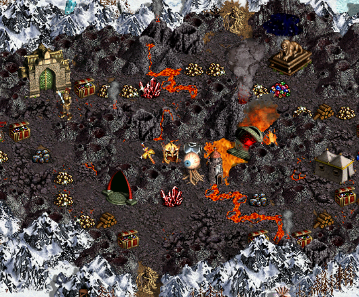 Każdy z ludzkich graczy ma w swoim bazowym terenie dodatkowe miasto swego stronnictwa, a także dwa Wrota, z czego drugie na wyspie. Oprócz tego sporo siedlisk, w tym neutralnych jednostek. Kopalni i artefaktów do zdobycia jest za to niewiele, zaś ekonomia ogranicza liczebność naszej armii nader boleśnie. Ważne są podziemia, gdzie oprócz kopalni złota możemy się wybrać w podróż do siedlisk 7 poziomu i jasnoniebieskiego. Generalnie tenże i jego różowy sojusznik są najgorszymi przeciwnikami z jakimi możemy mieć do czynienia. Pojawienie się tego pierwszego jest dość losowe, co uważam za jeden z błędów mapy, zaś aby dostać się do różowego należy go „odpieczętować” ze środka mapy. Jeśli nie, wówczas sam może wyjść zagarnąwszy Ostrze Armageddonu dla siebie… Do innych ludzkich graczy można dostać się garnizonem, który jest jednak silny i początkowo jest to niezbyt opłacalne.
